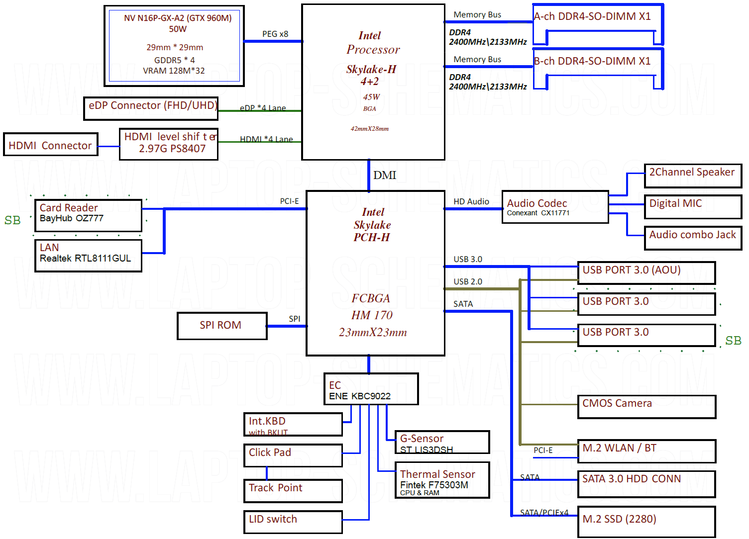 Also included: - Schematic Diagram for MB and I/O Board - BoardView file and BV Software - Power Up Sequence Timing Diagram Major components: CPU/HUB/RAM: Intel SkyLake-H / DDR4 GPU: UMA (Intel HD Graphics 530) / DIS (nVidia N16P-GX-A2 (GTX960M) + GDDR5 VRAM) EC: ENE KBC9022 File type : PDF (Searchable) BoardView: pcb Language : English |