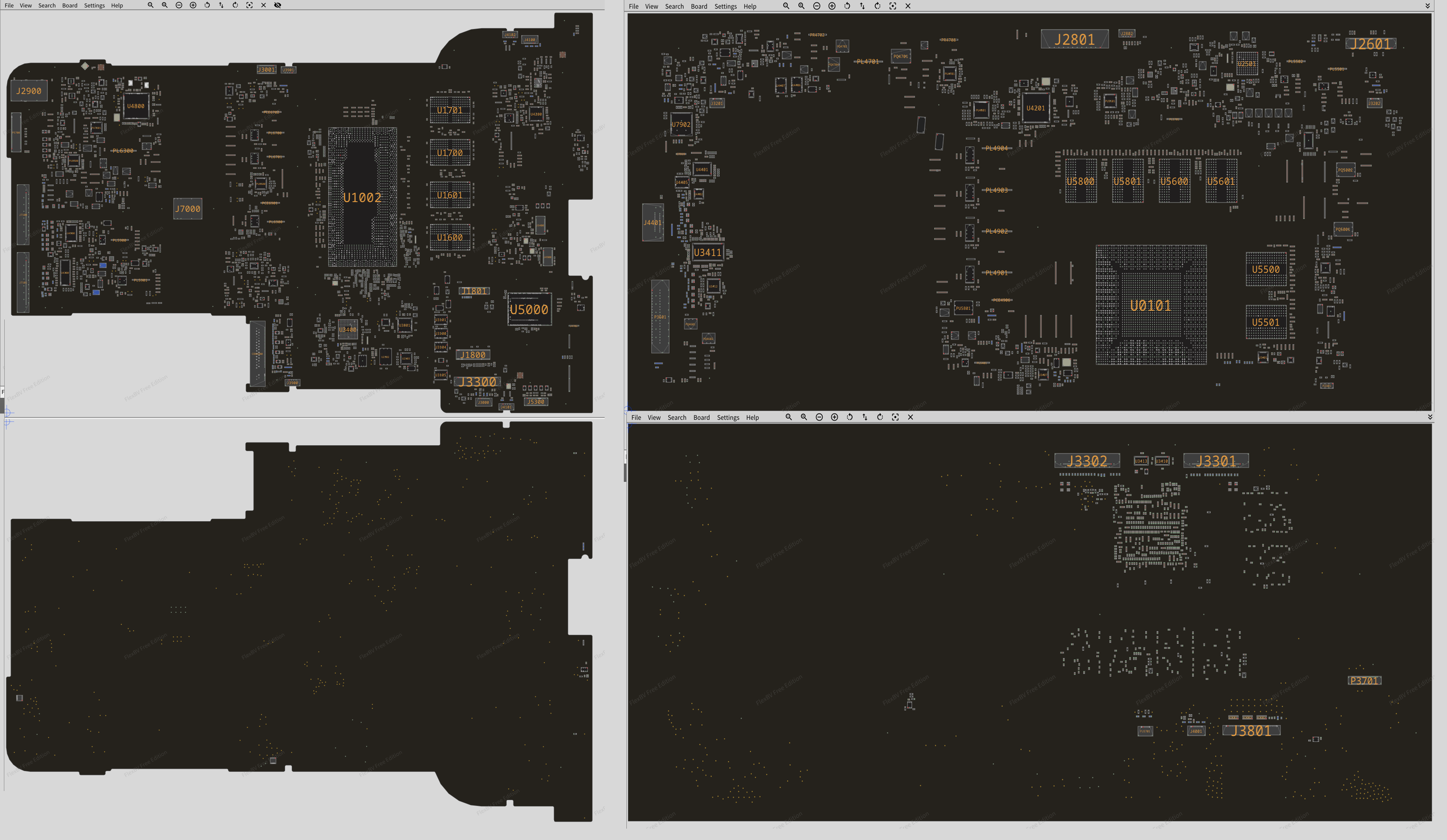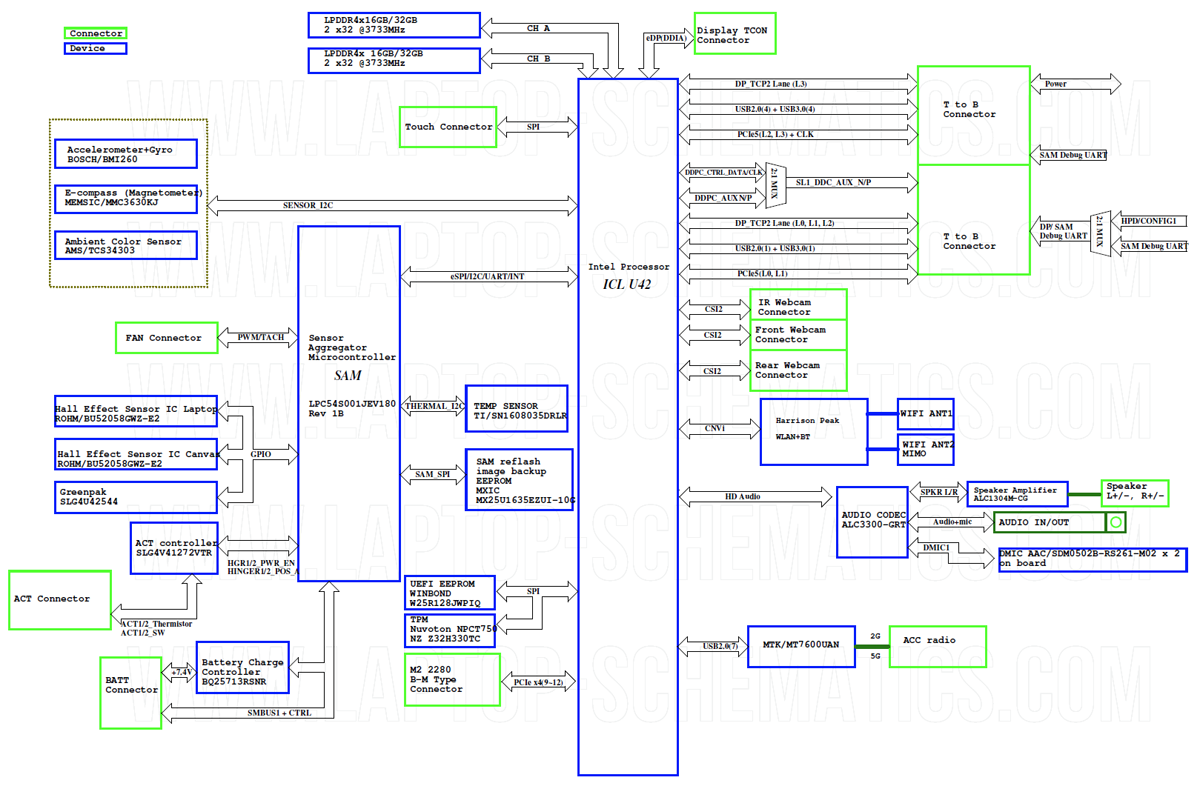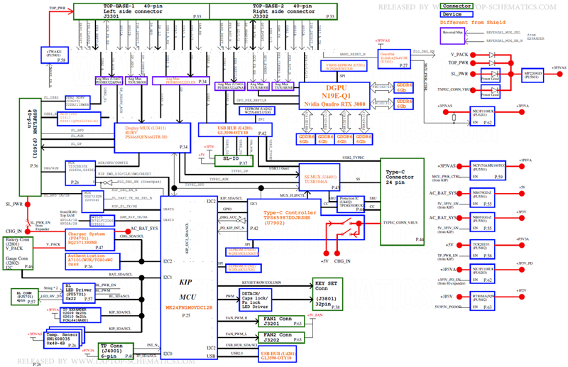 Known Motherboard (Top Board) p/n : Intel Core i7-1065G7 / 16Gb RAM - M???????-0?? (UNKNOWN #) Intel Core i7-1065G7 / 32Gb RAM - M???????-0?? (UNKNOWN #) Known "Bottom Board" p/n : M???????-0?? (UNKNOWN #) Known "I/O Board" (Cardreader/USB) p/n : M???????-0?? (UNKNOWN #) You will get: - For Motherboard (also known as "Top Board"): 1) Schematic Diagram 2) BoardView file and BoardView Software 2) Silkscreen / 2 PNG files 3) Clock Distribution Diagram 4) Power On Sequence and Reset Step-by-Step Block Diagram 5) Power Flow Diagram (Power Map) 6) I2C & SMBUS Map - For GPU Board (Bottom Board): 7) Schematic Diagram 7) BoardView file and BoardView Software 8) Silkscreen / 2 PNG files 9) Functional Block Diagram 10) GPU Power On Sequence Step-by-Step Block Diagram 11) GPU Power Down Sequence Step-by-Step Block Diagram 12) I2C / SMBus Block Diagram 13) Power Distribution Diagram - For "I/O Board" (Cardreader/USB) : 14) Schematic Diagram 15) BoardView file and BoardView Software Main components: - CPU/HUB/RAM: Intel "Ice Lake" / LPDDR4x - GPU: DIS (Nvidia Quadro RTX 3000 [N19E-Q1]) + 6Gb VRAM GDDR6 - SAM (Sensor Aggregator Microcontroller): LPC54S001JEV180 (Top Board) + MK24FN1M0VDC12R (Bottom Board) File types : Schematic diagrams : PDF (Searchable) BoardView files: PCB Component Placement Diagrams (Silkscreens): PNG files (High Resolution) |