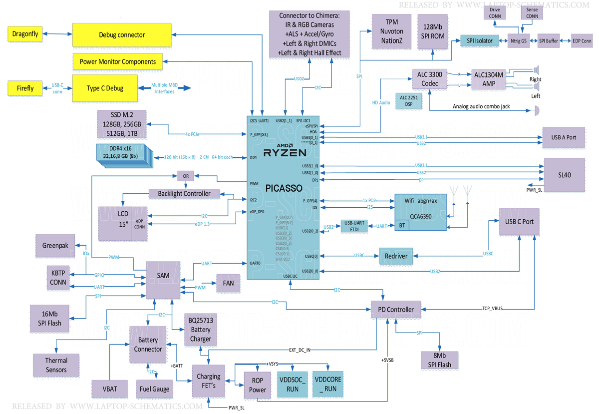 Known Motherboard p/n : M1095499-007 M1095499-008 What's included : 0) Schematic Diagram for motherboard 1) BoardView file + BoardView Software 2) Silkscreen / unsearchable PDF file 3) Clock Distribution Block Diagram 4) Power On Sequence and Reset Step-by-Step Block Diagram 4) Power Flow Diagram (Power Distribution Diagram) 5) I2C & SMBus Map Main components: - CPU/HUB/RAM: AMD Ryzen 5 3580U or Ryzen 7 3780U / DDR4 - GPU: UMA - SAM (Sensor Aggregator Microcontroller): LPC54S001JEV180 File types: Schematic Diagram(s) : PDF / Searchable Silkscreen for MB : PDF / unsearchable BoardView file(s) : PCB / Searchable Language : English |