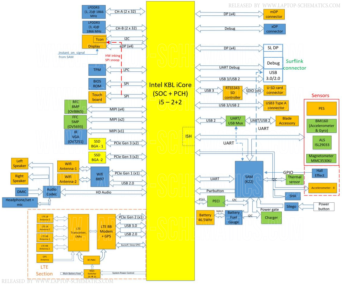 Microsoft Surface Pro 5 (LTE / KBL-U CPU), Motherboard BoardView files, Silkscreen and Schematic diagram