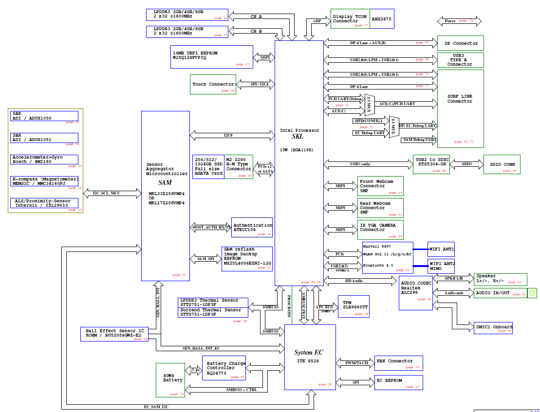 Motherboard p/n : X911788-009 What's included : - Schematic Diagram (searchable) - MB BoardView file and viewer - Touch Board BoardView file and viewer - Physical scanned image (HiRes) - Power On Sequence Diagram (Step-be-Step) - Clock Block Diagram - Power Sequence and Reset Step-by-Step Block Diagram - Power Distribution diagram (Power Flow) - Power Block Diagram - Power Sequence Timing Diagram - I2C & SMBus Map Main components: - CPU/HUB/RAM: Intel SkyLake-U23E i7-6650U / LPDDR3 - GPU: UMA (Intel IRIS 540) - EC/SAM (Sensor Aggregator Microcontroller): ITE8528 / MKL17Z256VMP4 or MKL33Z256VMP4 File types : Schematic Diagram: PDF (Searchable) BoardView files : PCB (Searchable) |