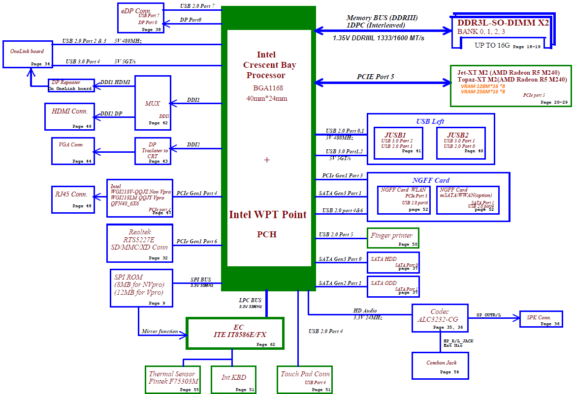 Also included : System Power block diagram Major components: Intel Crescent Bay Processor / WildCat Point PCH GPU: Integrated (UMA)/ Jet-XT M2 (AMD Radeon R5 M240) or Topaz-XT M2(AMD Radeon R5 M240) or Opal-XT R7 M265 (DIS) KBC: ITE IT8586E/FX File type : PDF (Searchable) Language : English |