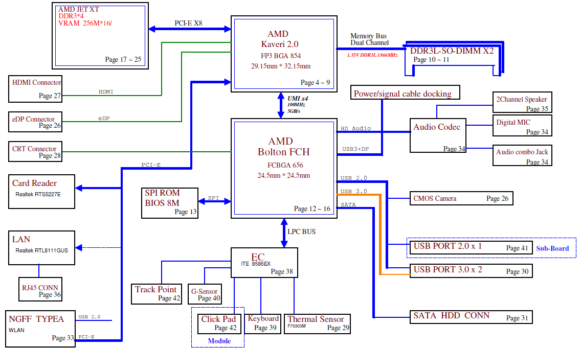 Also included : — Component Placement Diagram (Silkscreen/searchable PDF file), it's not a boardview file such as: .TVW, .BRD etc... — Power Sequence timing diagram — SMBus block diagram Major components: AMD Kaveri 2.0 Processor with DDR3L + Bolton FCH GPU: Integrated (UMA)/ AMD Topaz-XT or AMD JET-XT (DIS) KBC: ITE 8586EX File type : PDF (Searchable) Language : English |