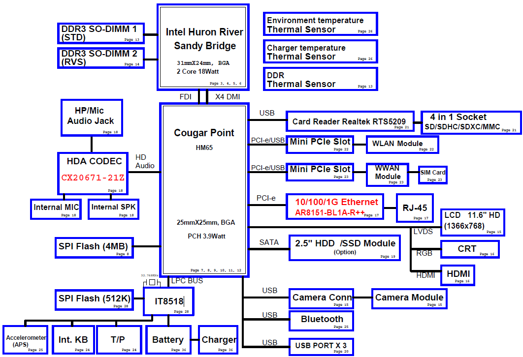 Also included: BoardView file and BoardView software Power Block Diagram Power On Sequence block diagram USB board schematic diagram Power Button schematic diagram FingerPrint board schematic diagram CRT board schematic diagram Major components: Intel HR Sandy Bridge / Cougar Point HM65 PCH GPU: Integrated (UMA) KBC: IT8518 File type : PDF (Searchable) Language : English |