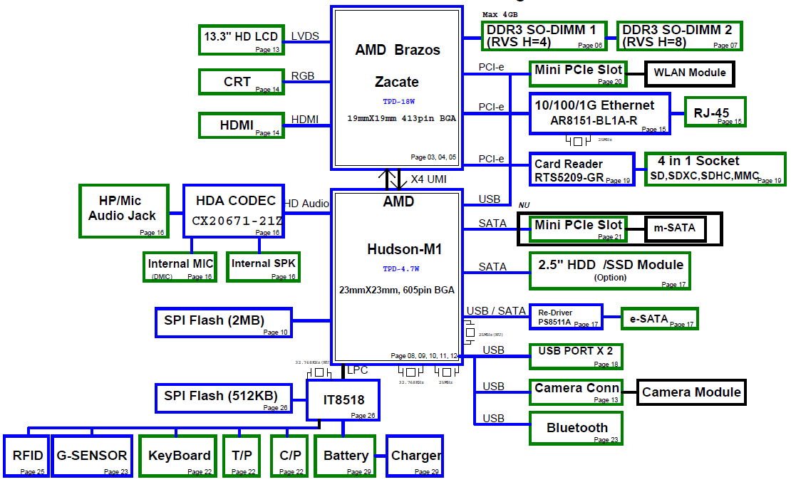 Also Included: 2 BoardView files (Allegro and BDV) + BoardView software System Power Block Diagram Power On Sequence diagram Major components: AMD Brazos Zacate + Hudson-M1 GPU: Integrated (UMA) KBC: IT8518 File type : PDF (Searchable) Language : English |