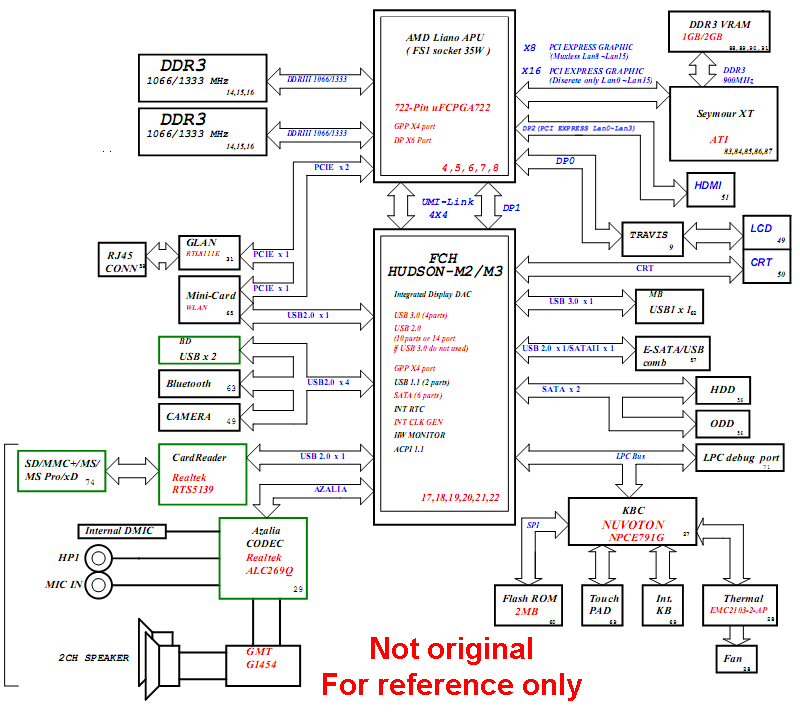 Important!!! Unfortunately the original schematic diagram is not yet available. At this moment there is a BoardView file only. The offered schematic diagram is very close to original one. It has the same main components and circuits and could be used for reference. Also included : BoardView file (original) and BoardView software Major components: AMD Liano FS1 + AMD A60M HUDSON-M2/M3 FCH GPU: Integrated (UMA)/AMD Seymour XT (Radeon HD6470M) (DIS) KBC: Nuvoton NPCE791G File type : PDF (Searchable) Language : English |