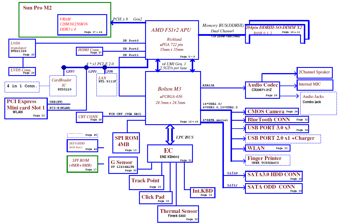 Major components : APU: AMD Richland FS1r2 + FCH Bolton-M3 GPU:Integrated (UMA) / AMD Sun Pro M2 (DIS) EC: ENE KB9012 File type : PDF (Searchable) Language : English |
