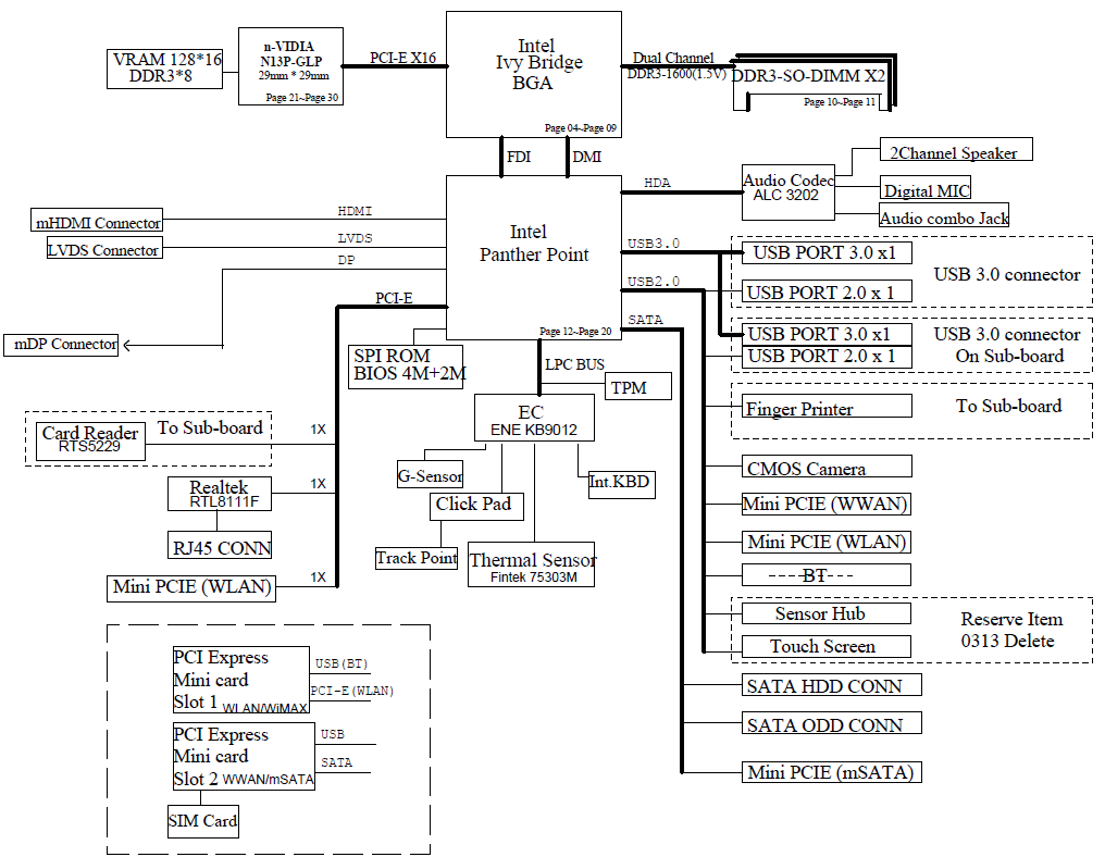 ! schematic diagram for MB without Thunderbolt port ! Also included: IO Board schematic diagram FingerPrint Board schematic diagram Power Board schematic diagram ThinkLight Board schematic diagram Second HDD Board schematic diagram C-Logo Board schematic diagram Major components: Intel Ivy Bridge + Panther Point GPU:Integrated (UMA) / nVidia N13P-GLP (DIS) EC: ENE KB9012 File type : PDF (Searchable) Language : English |
